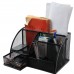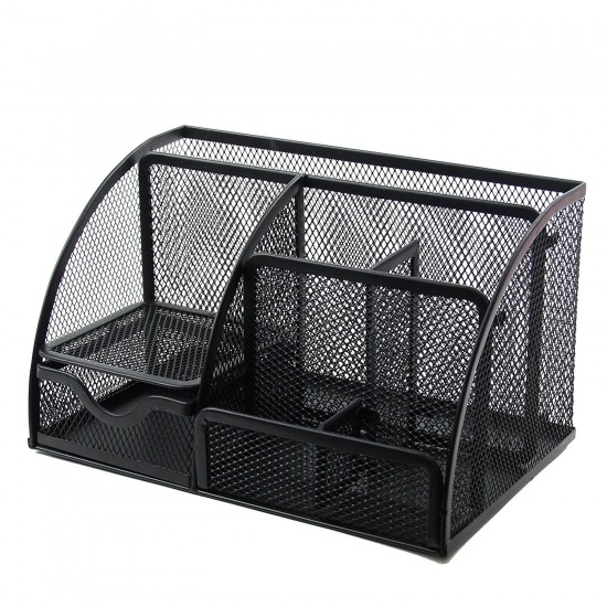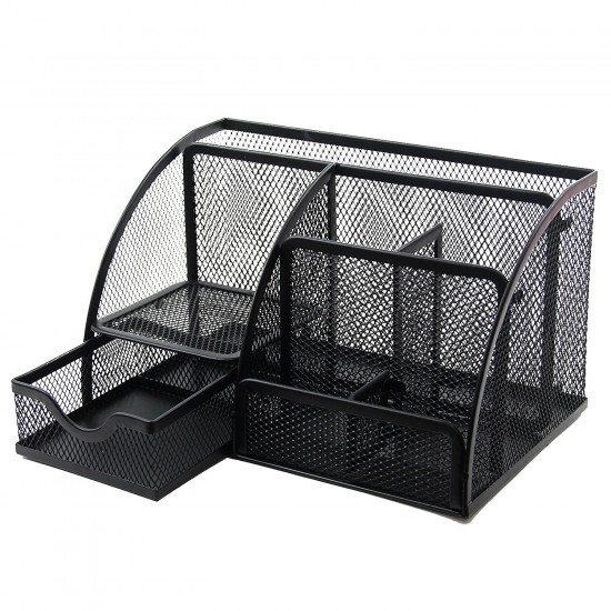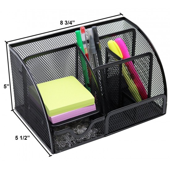 Office desktop caddy organizer, great for keeping your desktop neat and tidy. Made of durable scratch resistant steel wire mesh with a reinforced metal rim. Features 5 compartments + 1 mini sliding drawer for pads, papers, pen/pencils, note pads, supplies etc. Approximate Dimensions in inches: 8.75 W x 5.5 D x 5 H.